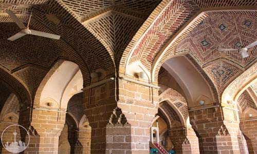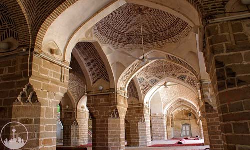 The mosque has four small entrances, three of which are blocked. The north west facade is a remnant of the 12th century AH and is adorned with arches and tile works. The main part of the current mosque is its pillared nocturnal area to the south. The ceiling and brick dome of this Shabestan is erected on stone pillars. The eastern porch is a construction of the Safavid era, while the nocturnal area of the mosque is its oldest segment. On the northern and western side walls of the mosque the dates of 13th and 14th centuries AH have been designated.